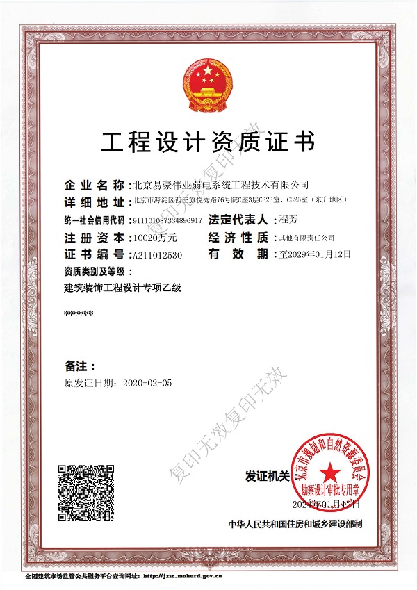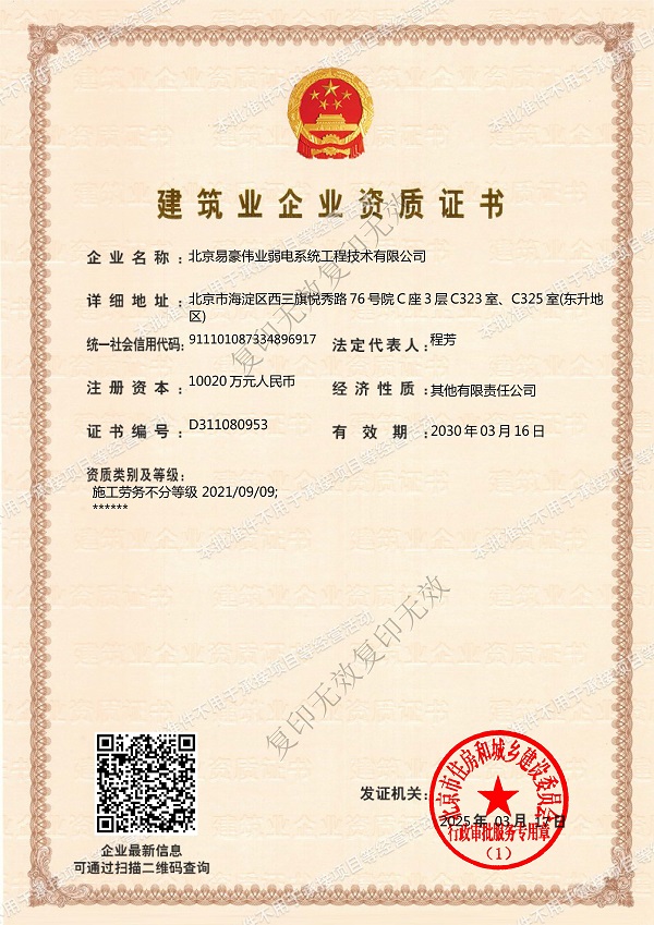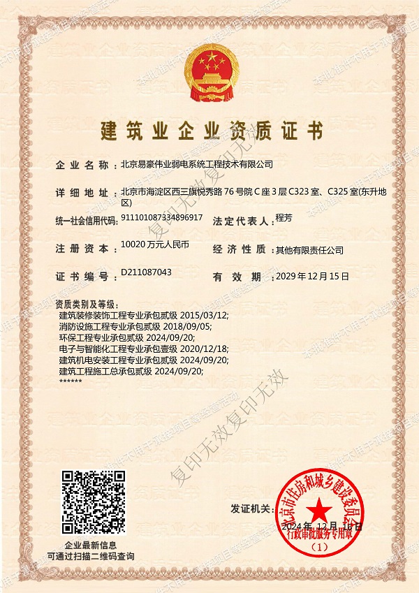 電子與智能化工程專業(yè)承包壹級、建筑工程施工總承包貳級、建筑裝修裝飾工程專業(yè)承包貳級、
