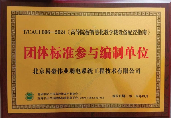 《高等院校智慧化教學(xué)樓設(shè)備配置指南》團體標(biāo)準(zhǔn)參與編制單位證書
